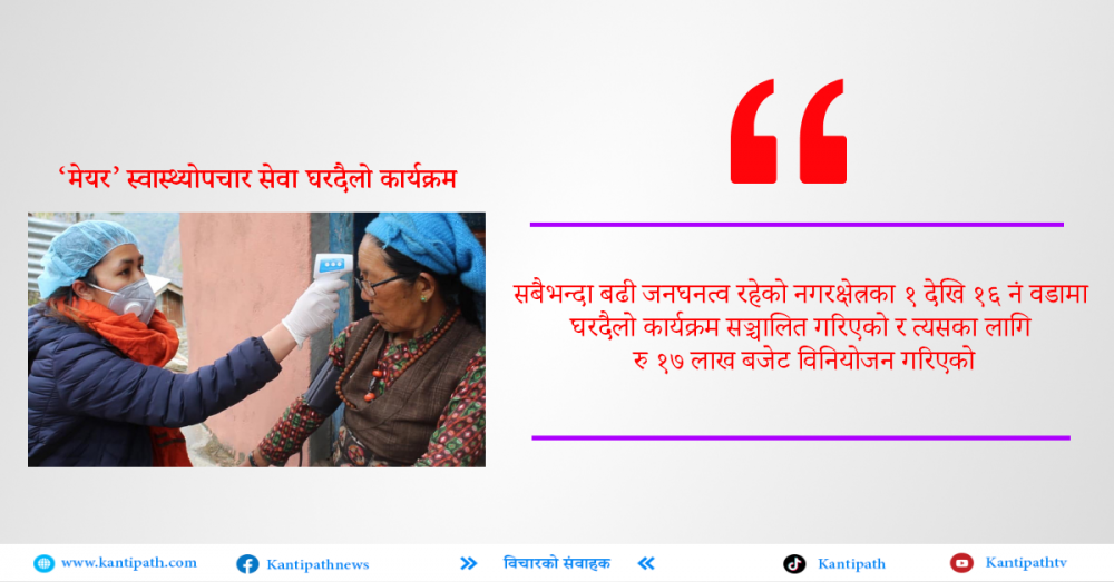 महानगरपालिकाले आफ्नो कार्य क्षेत्रभित्र रहेका सबैजसो स्वास्थ्य संस्थालाई प्रभावकारीरुपमा अघि बढाउँदै सर्वसाधारणलाई स्वास्थ्य उपचारमा सहज पहुँच पुर्याउन विभिन्न कार्यलाई अगाडि बढाउँदै आएको छ । यसै क्रममा अस्पताल तथा स्वास्थ्य संस्थासम्म उपचारका लागि आउन असहज हुने समुदायलाई लक्षित गरी महानगरपालिकाले सुरक्षित मातृत्व र ज्येष्ठ नागरिक समुदायको स्वास्थ्य उपचार सेवाका लागि घरदैलो कार्यक्रम सुरु गरेको हो । त्यसअन्तर्गत दक्ष चिकित्सकसहितको टोलीले ज्येष्ठ नागरिक, गर्भवती तथा सुत्केरी महिलाको घरमैघरमै पुगेर प्रारम्भिक चरणको स्वास्थ्योपचार सेवा उपलब्ध गराउँदैछ ।