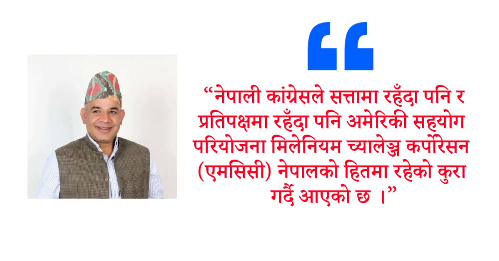 आज यहाँ आयोजित एक कार्यक्रममा उहाँले भन्नुभयो, “नेपाली कांग्रेसले सत्तामा रहँदा पनि र प्रतिपक्षमा रहँदा पनि अमेरिकी सहयोग परियोजना मिलेनियम च्यालेञ्ज कर्पोरेसन (एमसिसी) नेपालको हितमा रहेको कुरा गर्दै आएको छ ।” नेता आचार्यले नेपाललाई आवश्यकपर्ने आयोजना छनोटका लागि नेपाल सरकार र एमसिसीको संयुक्त लगानीमा सञ्चालन हुने ६३ करोड अमेरिकी डलरको पूर्वाधार आयोजना व्यवस्थापनका लागि मिलेनियम च्यालेञ्ज एकाउन्ट नेपाल विकास समिति (एमसिए–नेपाल) स्थापना भएको भन्दै सो विकास समिति नेपालको विकास समिति ऐन, २०१३ अनुसार स्थापित भएको बताउनुभयो ।