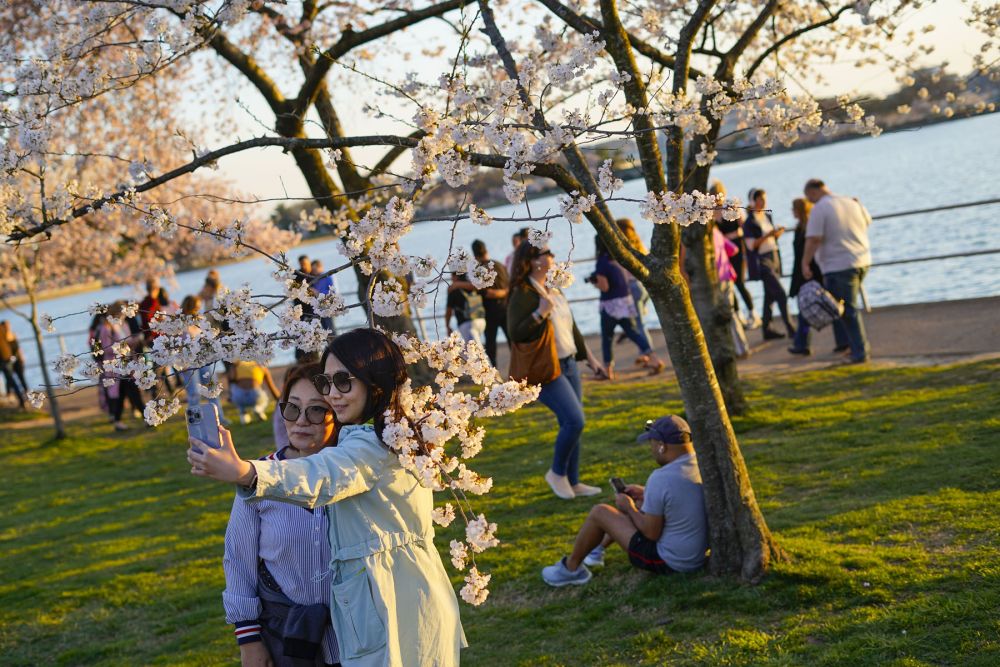 People under the Cherry Blossom trees take pictures, Monday, March 21, 2022, as the trees reach their peek bloom in Washington.