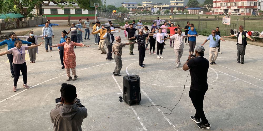 विश्व स्वास्थ्य दिवसको अवसरमा व्यायाम सिक्दै सर्वसाधारण