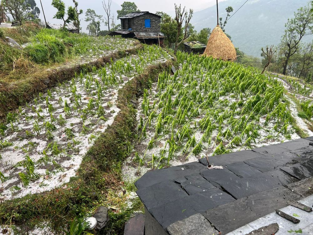 म्याग्दीको बेनी रघुगङ्गा गाउँपालिका– ४ दग्नाममा शनिबार र आइतबार दिउँसो परेको असिनाले नष्ट गरेको मकैबाली । भीषण वर्षासहितको असिनाले यहाँ लगाइएको हिउँदैबालीमा क्षति पुर्याएको छ ।