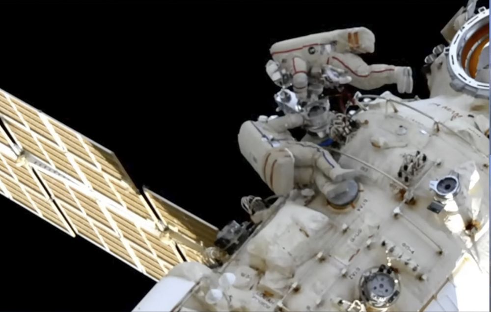 In this photo taken from video footage released by Roscosmos Space Agency, Roscosmos’ cosmonauts Oleg Artemyev and Denis Matveev are seen during their spacewalk on the International Space Station (ISS), Monday, April 18, 2022.