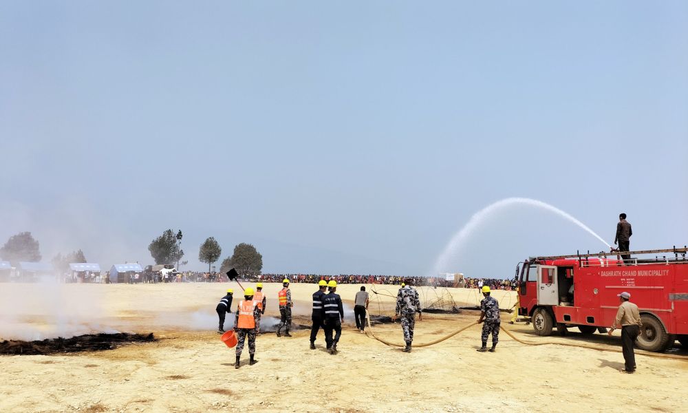 नेपाल रेडक्रस सोसाइटी, जिल्ला प्राशासन कार्यालय, जिल्ला विपद् व्यवस्थापन समितिको आयोजनामा बैतडीको सुन्दरखाली खेल मैदानमा भूकम्प आउँदा र आगलागी भएको समयमा नागरिकले अपनाउनुपर्ने विपद् व्यवस्थापनको पूर्वाभ्यास सिकाइँदै ।