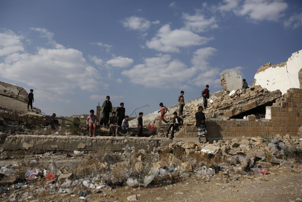 Yemeni students are seen at the destroyed Shuhada-Alwahdah school in Al-Radhmah district, Ibb province, western Yemen, on April 11, 2022. Thousands of schools have been destroyed and abandoned in Yemen as a result of the civil war, according to teacher’s unions, which warn that illiteracy among the younger generation is on the rise and the country’s future is being gradually destroyed