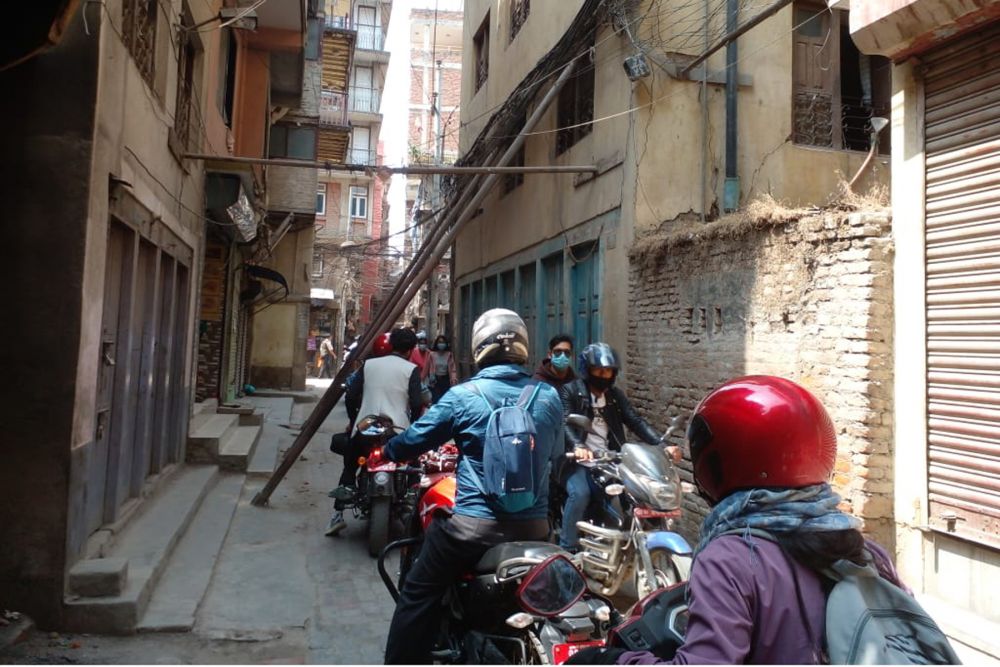 काठमाडौँ महानगरपालिका वडा नं २३ स्थित चिकमुङ्गलमा टेकोका भरमा अडिएका घरमुनिको सडकबाट यात्रा गर्दै सवारी र यात्रु । विसं २०७२ वैशाख १२ को भूकम्पले भत्किएका मुख्य शहर भित्रका संरचना अझै पुनःनिर्माण सम्पन्न भएको छैन ।