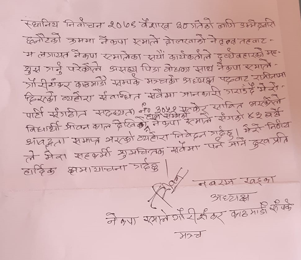 नेकपा (एमाले) निकट गौरीशंकर-काठमाडौँ सम्पर्क मन्चका अध्यक्ष नवराज खड्का आफ्नो जिम्मेवारीबाट राजिनामा दिएका छन् । गौरीशंकर गाउँपालिकाको अध्यक्षको उम्मेदवारको टुंगो लगाउने विषयमा चित्त दुखेको भन्दै उनले प्रेस-विज्ञप्ति निकाल्दै जिम्मेवारी मुक्त भएको बताएका छन् ।