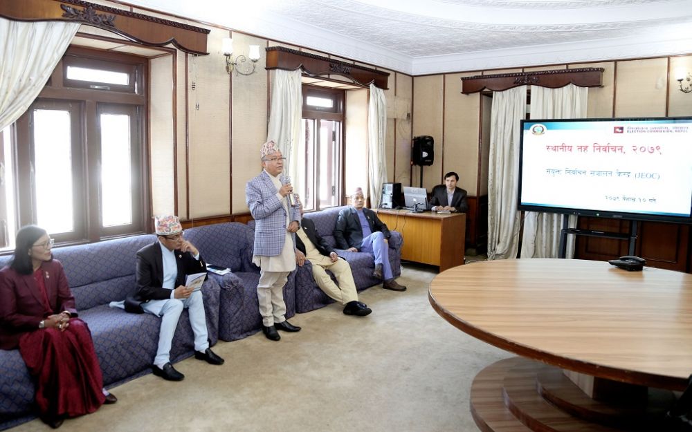 निर्वाचन आयोगले आसन्न स्थानीय तहको निर्वाचनका क्रममा आजदेखि संयुक्त निर्वाचन सञ्चालन केन्द्र (जेइओसी) कार्यान्वयनमा ल्याएको छ ।आयोगको संयोजकत्वमा गृह मन्त्रालय, विभिन्न सुरक्षा निकाय र सम्बन्धित निकायका उच्चस्तरका प्रतिनिधि रहेको सो केन्द्र आज आयोगको कार्यालय बहादुरभवनमा प्रमुख निर्वाचन आयुक्त दिनेशकुमार थपलियाले शुभारम्भ गर्नुभयो ।
