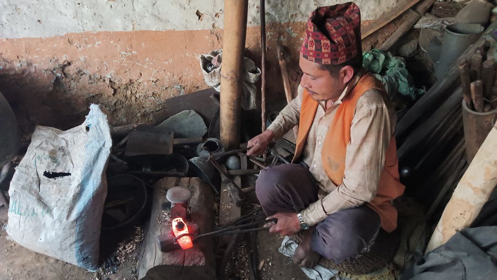 ताप्लेजुङको फुङ्लिङ नगरपालिका—६ गुम्बाडाँडा क्षेत्रमा आरनमा औजार बनाउँदै एक पुरुष ।