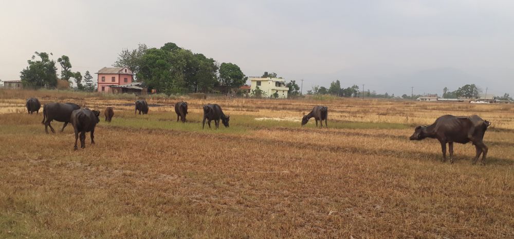 घोराही– ६ का किसान बाली भित्र्याएपछि व्यावसायिक रुपमा पालिएको भैँसी खेतमा चर्दै । कृषकले भैँसी पालनबाट मनग्य आम्दानी गरेका छन् ।