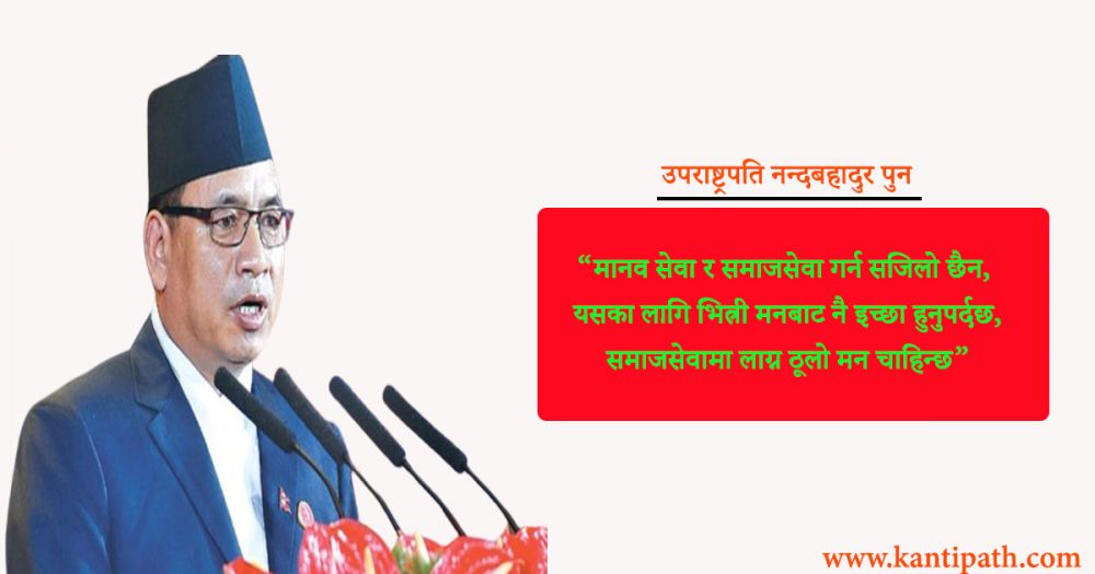 उपराष्ट्रपति नन्दबहादुर पुनले समाजसेवामा सामाजिक सङ्घसंस्थाको भूमिका महत्वपूर्ण रहेको बताउनुभएको छ । फोकस नेपालले शनिबार लोकतन्त्र दिवसका अवसरमा आयोजना गरेको ‘समुन्नत नेपाल निर्माणमा सामाजिक सङ्घसंस्थाको भूमिका’ विषयक विचार गोष्ठीलाई सम्बोधन उहाँले समाजको सेवामा सामाजिक सङ्घसंस्थाको महत्वपूर्ण भूमिका रहेको बताउनुभएको हो ।