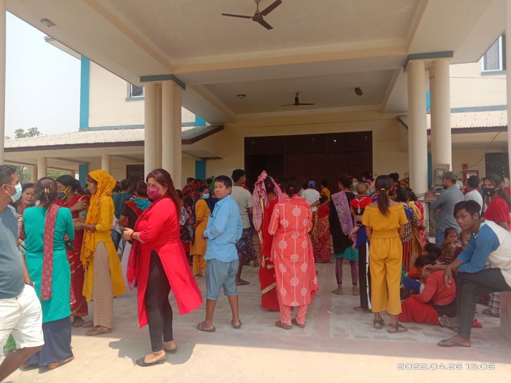 कैलालीको टीकापुर नगरपालिका– १ मा कोरोनाविरुद्धको बुस्टर डोज खोपका लागि पालो कुर्दै स्थानीय ।
