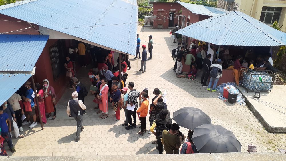 जिल्ला प्रशासन कार्यालय तनहुँमा नेपाली नागरिकता प्रमाणपत्र बनाउनका लागि लामबद्ध सेवाग्राही । नागरिकताका लागि चर्को घामको पनि कुनै प्रवाह नगरी लामबद्ध बस्न बाध्य छन् ।