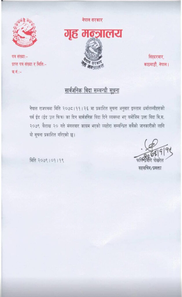 सरकारले भोलि वैशाख २० गते ईद उल फित्रको उपलक्ष्यमा सार्वजनिक विदा दिने निर्णय गरेको छ। नेपाल राजपत्रमा प्रकाशित सूचना अनुसार इस्लाम धर्मालम्बीहरुको पर्व ईदका दिन विदा सार्वजनिक विदा दिने व्यवस्था भएको गृहमन्त्रालयले जनाएको छ।