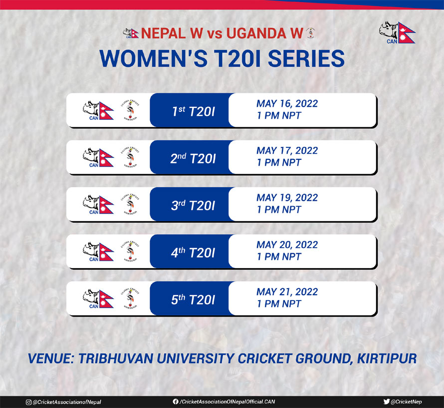 नेपाली राष्ट्रिय महिला क्रिकेट टिमले अफ्रिकी देश युगाण्डासँग पाँच खेलको टी–२० शृंखला खेल्ने भएको छ। नेपाली महिला क्रिकेटकाे इतिहासमै पहिलाेपल्ट टी-२० शृंखला हुन लागेकाे हाे ।