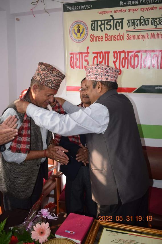 हिजो मिति २०७९ साल जेठ १८ गते श्री बासडाेल सामुदायिक बहुउद्देश्यीय सहकारी संस्था लि. काे आयाेजनामा स्थानीय तह निर्वाचन अन्तरगत बनेपा नगरपालिकाबाट निर्वाचित पदाधिकारीहरुलाई बधाई तथा शुभकामना कार्यक्रम संस्थाका अध्यक्ष वकिलनाथ शर्मा वाग्लेकाे सभापतित्वमा बनेपा नगरपालिकाका नगर प्रमुख शान्ति रत्न शाक्य, उप प्रमुख विमला सापकोटा दाहाल, बनेपा १२ का वडा अध्यक्ष राम बहादुर कुँवर,वडा सदस्यहरू क्रमशः यसाेदा शर्मा, नारायण रावल, ठुलीकान्छी रपाल, सागर लामा, संस्थाका लेखा संयोजक उद्वव वाग्ले, प्रमुख सल्लाहकार मुकुन्द शर्मा सल्लाहकार प्रेम बहादुर तामाङ, कुमार कार्की, रामेश्वर खत्री, लेखा समिति र संचालक समितिका सदस्य, विभिन्न उपसमितिका सदस्यहरू, शेयर सदस्य तथा कर्मचारीहरूकाे उपस्थितिमा संचालन भई सम्पन्न गिरयाे ।