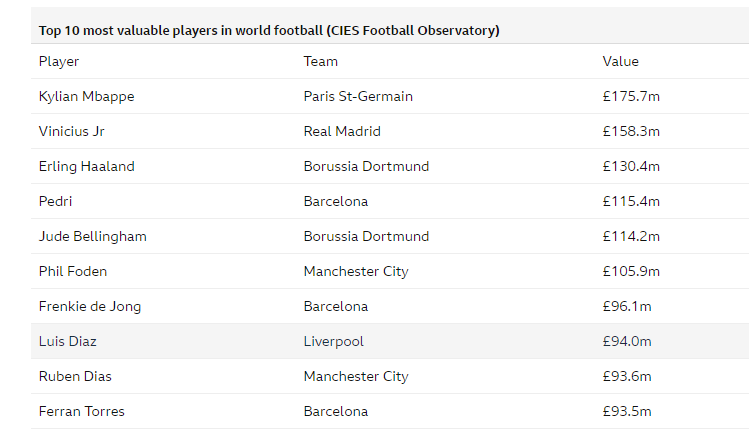 यस्तै, दोस्रो स्थानका स्पेनिस क्लब रियल मड्रिडका ब्राजिलियन युवा स्टार भिसिनियस जुनियरको बजार मूल्य १५८ मिलियन पाउण्ड छ । यस्तै, गत सिजनसम्म जर्मन क्लब बोरुसिया डर्टमन्डका लागि खेलेका नर्वेका स्टार एर्लिङ ब्राउट हालान्ड १३० मिलियन पाउण्डसहित तेस्रो तथा बार्सिलोनाका स्पेनिस युवा खेलाडी पेड्री ११५.५ मिलियन पाउण्डसहित चौथो स्थानमा छन् । बोरुसिया डर्टमण्डका इंग्लिस स्टार जुडे बेलिङ्घम ११४.१ मिलियन पाउण्डसहित पाँचौं स्थानमा छन् ।