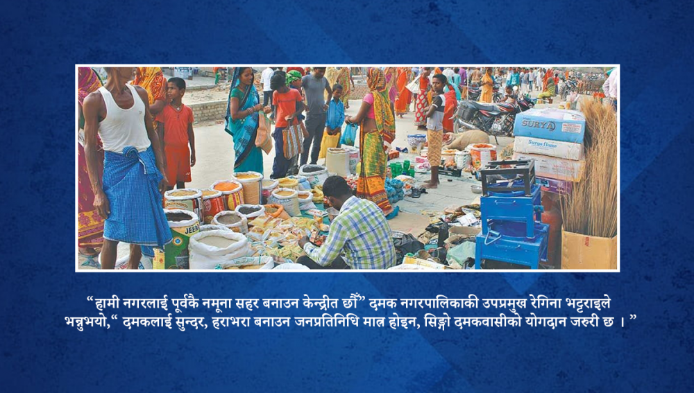 नगरपालिकाले दमकलाई सुरक्षित र सुन्दर बजारको रुपमा चहलपहल बढाउन संरचनागत काम गर्दै आएको छ । चोक र बजारको सडकपेटीमा सौन्दर्य बढाउन फूल रोप्न र फोहरमैला सङ्कलनका लागि डस्बिन राखेर आर्कषक बनाउने योजना सञ्चालित छन् । “हामी नगरलाई पूर्वकै नमूना सहर बनाउन केन्द्रीत छौँ” दमक नगरपालिकाकी उपप्रमुख रेगिना भट्टराइले भन्नुभयो,“ दमकलाई सुन्दर, हराभरा बनाउन जनप्रतिनिधि मात्र होइन, सिङ्गो दमकवासीको योगदान जरुरी छ । ”