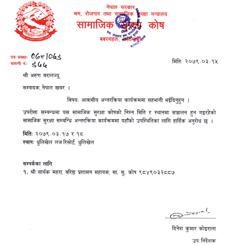 सामाजिक सुरक्षा कोषले असारमा बजेट सक्काउने उद्देश्यले धुलिखेलमा दुई दिने अन्तरक्रिया कार्यक्रम आयोजना गरेको छ । कोषले विभिन्न मिडिया र पत्रिकाका सम्पादकलाई पनि कार्यक्रममा निम्ता गरेको थियो तर नेपालखबरका सम्पादक अरुण बरालले त्यसलाई इन्कार गरेका छन् ।