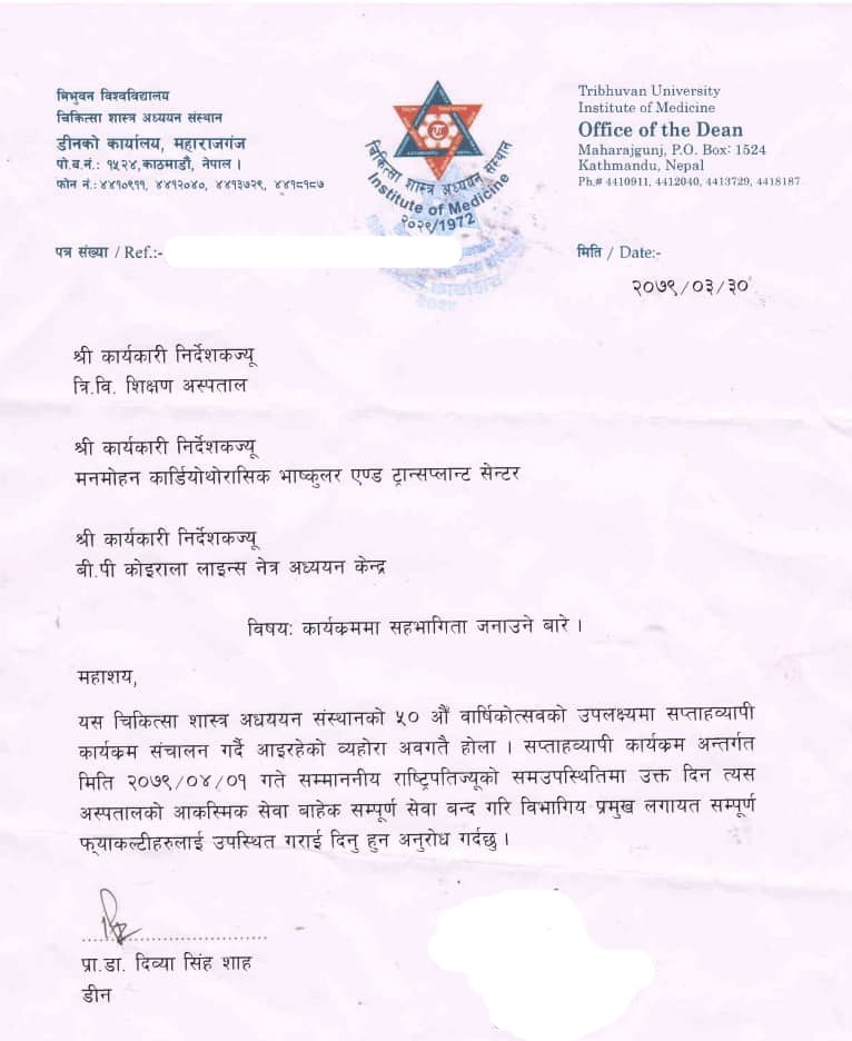 आईओएमकी डिन दिव्या सिंह शाहले शिक्षण अस्पताल, मनमोहन कार्डियोथोरासिक भास्कुलर एन्ड ट्रान्सप्लान्ट सेन्टर र बीपी कोइराला लायन्स नेत्र अध्ययन केन्द्रलाई पत्र काट्दै सेवा बन्द गरी कार्यक्रममा सहभागी हुन निर्देशन दिएको एक प्राध्यापकले बताए ।