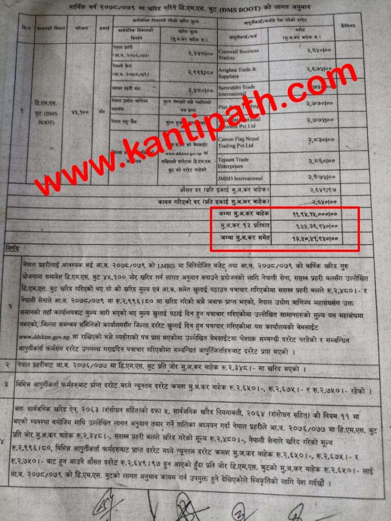 व्यापारी केशर प्रधानको कर्नवाल बिजनेस ट्रेडर्स कम्पनीले २ हजार ६ सय ५० मूल्यमा टेण्डर पारेको थियो । सोही अनुसार उनको कम्पनीले जिल्ला प्रहरी कार्यालयमा पठाएको डिएसएम बुट गुणस्तरहीन परेको हो । मोर्डन सुज लिमिटेडलाई सार्वजनिक खरिद अनुगमनको कार्यालयले २०७८ माघ १२ गते कालोसुचीमा राख्नका लागि स्पष्टिकरण समेत सोधेको थियो ।