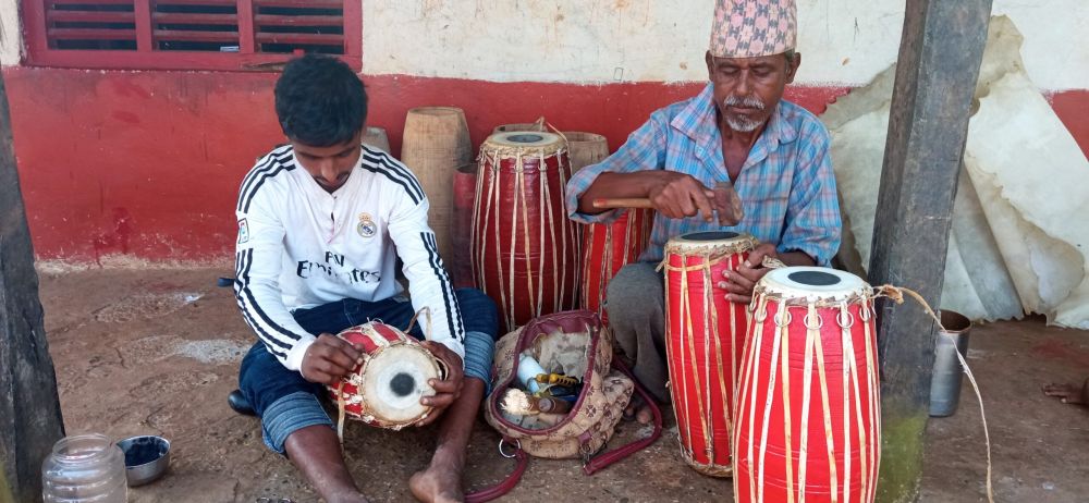 रामपुर (पाल्पा), ११ असोज : सेतै फुलेका कपालमाथि ढाकाटोपी, चिटिक्क परेको सानो घरको पिँढीमा बसेर मादलमा खरी भर्नमै ध्यान तानिएको छ रामबहादुर वादीको । उहाँ आफ्नै सुरमा बिहान उज्यालो भएदेखि साँझसम्म मादल बनाउनमा व्यस्त हुनुहुन्छ ।