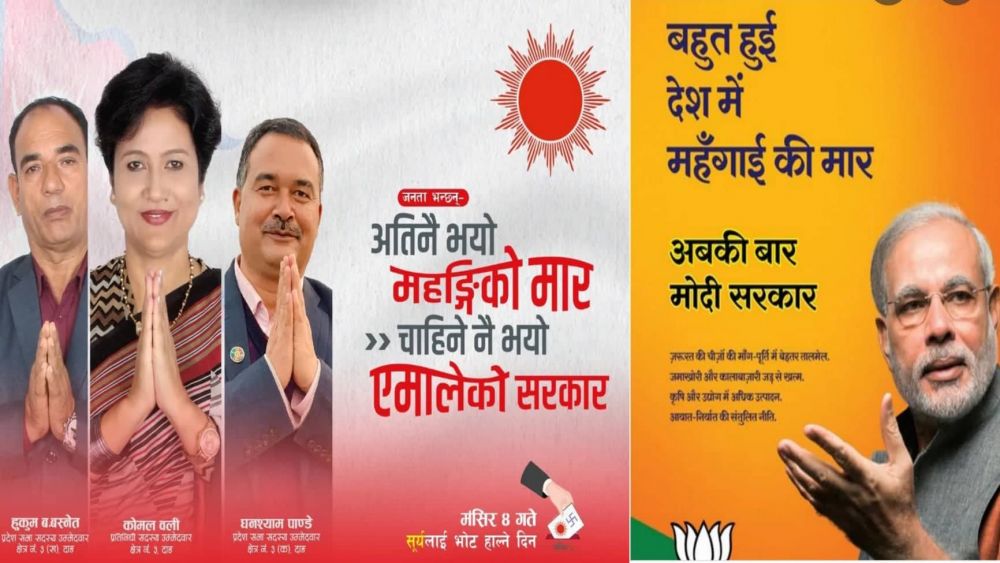 तर,यही नारा भारतका प्रधानमन्त्री मोदीले पहिले नै ल्याएका थिए । मोदीको ब्यानरमा उनको फोटोसहित ‘बहुत हुइ देशमें महंगाइकी मार, अबकी बार मोदी सरकार !’ लेखिएको छ ।
