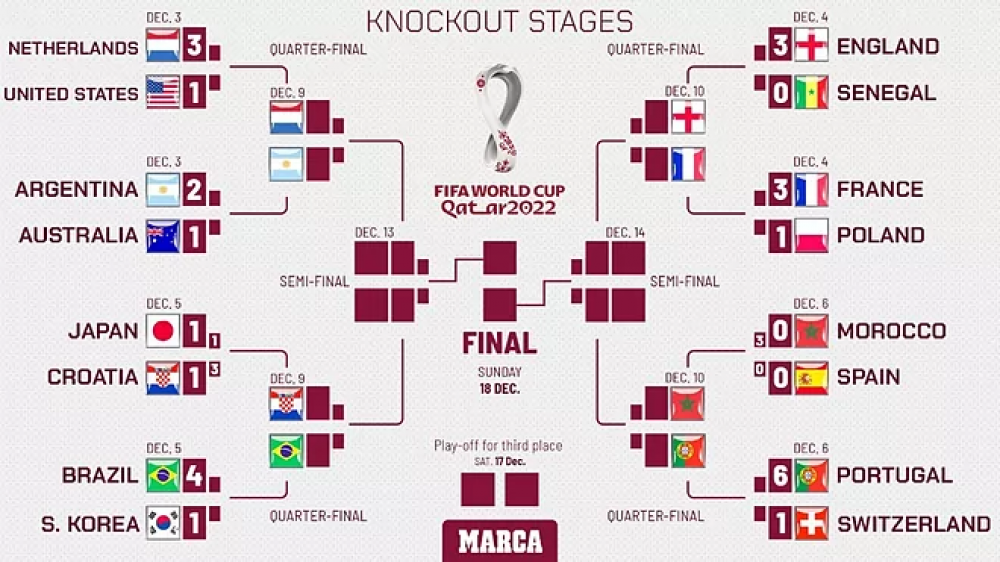 एउटा समूहबाट नेदरल्याण्ड्स, अर्जेन्टिना, क्रोएसिया र ब्राजिलले क्वार्टरफाइनलमा स्थान बनाएका छन्। अर्को समूहबाट इङ्ल्याण्ड, फ्रान्स, मोरक्को र पोर्चुगल क्वार्टरफाइनलमा पुगेका हुन्।
