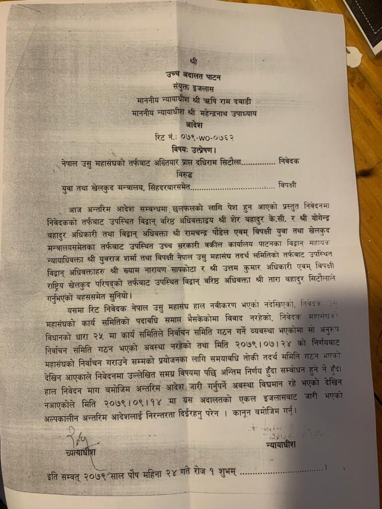यसअघि गत पुष १४ गते उच्च अदालत पाटनको एकल इजलासले अल्पकालिन अन्तरिम आदेश जारी गरेको थियो । संयुक्त इजलासको आदेशमा रिट निवेदक नेपाल उसु महासंघ हाल नविकरण भएको नदेखिएको, निवेदक उसु महासंघको कार्य समितिको पदावधि समाप्त भइसकेकोमा विवाद नरहेको उल्लेख गरिएको छ ।