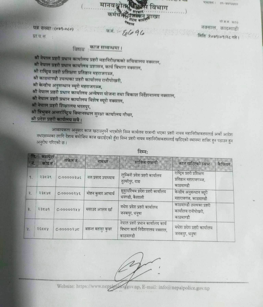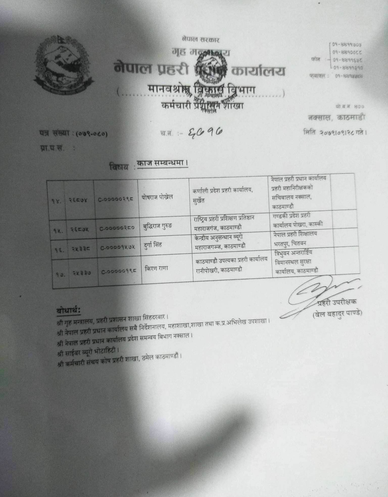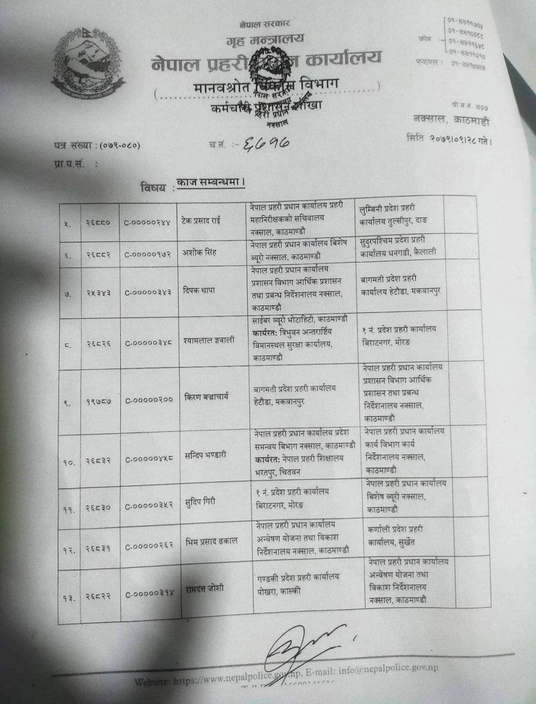 काज सरुवा हुनेमा केन्द्रीय प्रहरी प्रवक्ता डीआईजी टेकप्रसाद राईसमेत छन्। उनलाई लुम्बिनी प्रदेश प्रहरी कार्यालय, तुल्सीपुर, दाङमा काज खटाइएको छ। दिपक थापाले बागमतीको जिम्मा पाएका छन् ।