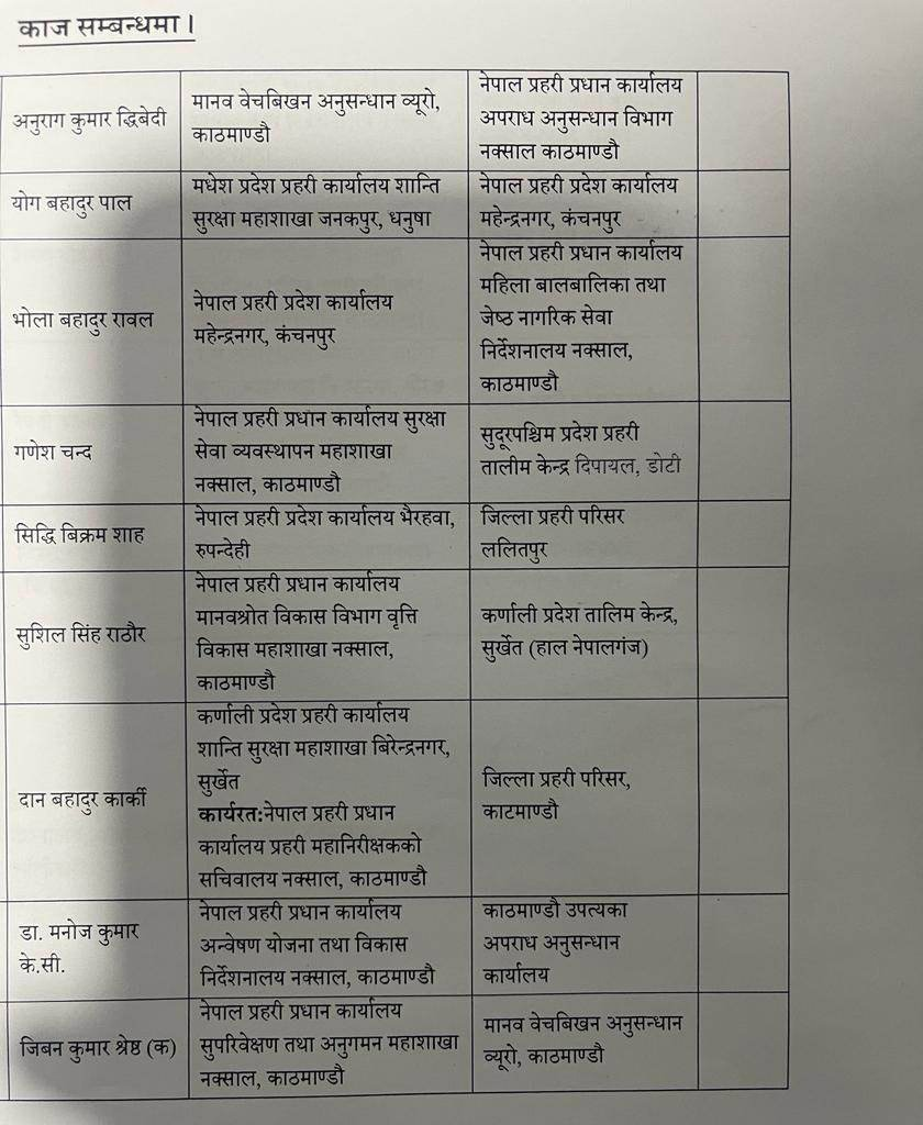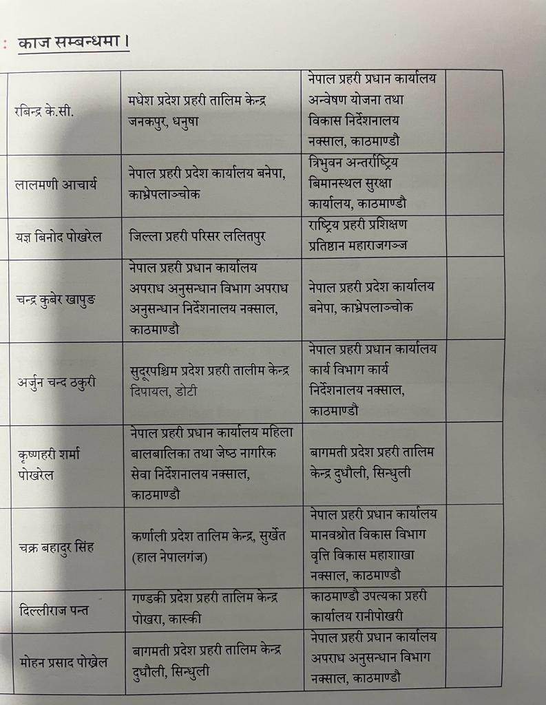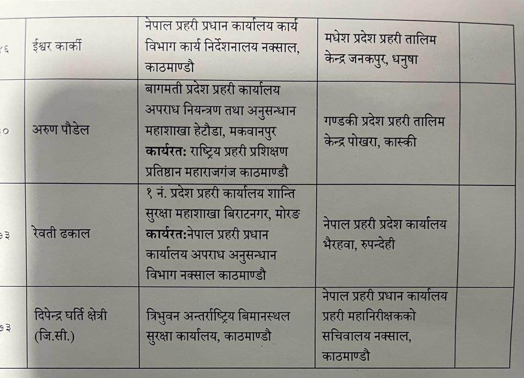 ललितपुर प्रहरी प्रमुखमा प्रदेश प्रहरी कार्यालय, रूपन्देहीमा कार्यरत सिद्धिविक्रम शाहको सरुवा भएको छ।। काठमाडौं उपत्यका अपराध अनुसन्धान कार्यालयमा डा. मनोजकुमार केसी सरुवा भएका छन्।