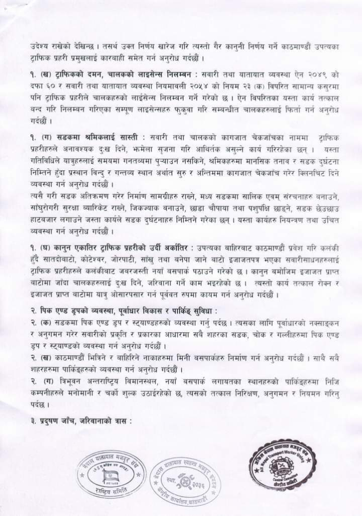 ऐन कानुन कार्यान्वयन गरी ट्राफिक प्रहरीले लिने चर्को शुल्क खारेज गर्नुपर्ने, चालकको निलम्बन गरिएका लाइसेन्स फुकुवा गर्नुपर्ने, सडकमा यातायात श्रमिकलाई ट्राफिकले दिएको दुःख अन्त्य हुनुपर्ने, पिक एण्ड ड्रपको व्यवस्था, पूर्वाधार विकास र पार्किङ सुविधा हुनुपर्ने, काठमाडौँ भित्रिने र बाहिरीने नाकामा मिनि बसपार्क निर्माण गर्नसमेत माग गरेको छ ।