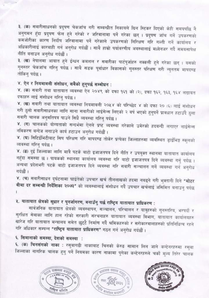 प्रदूषण जाँचमा देखिएका कमीकमजोरी हटाउनुपर्ने, सवारी तथा यातायात व्यवस्था ऐन २०४९ को दफा १६१ को (२), दफा १६२, १६३, १६४ लगायत दफालाई संशोधन गर्नुपर्ने, सवारी तथा यातायात व्यवस्था नियमावली २०५४ को परिच्छेद ४ को दफा २० (६) लाई संशोधन गरी ठूलो सवारीसाधनका लागि साना सवारीको लाइसेन्स लिएको दुई वर्ष भएको हुनुपर्ने प्रावधान हटाउँदै ठूला सवारी चालक अनुमतिपत्र पाउने सिधैँ व्यवस्था गर्नुपर्ने बताएको छ ।
