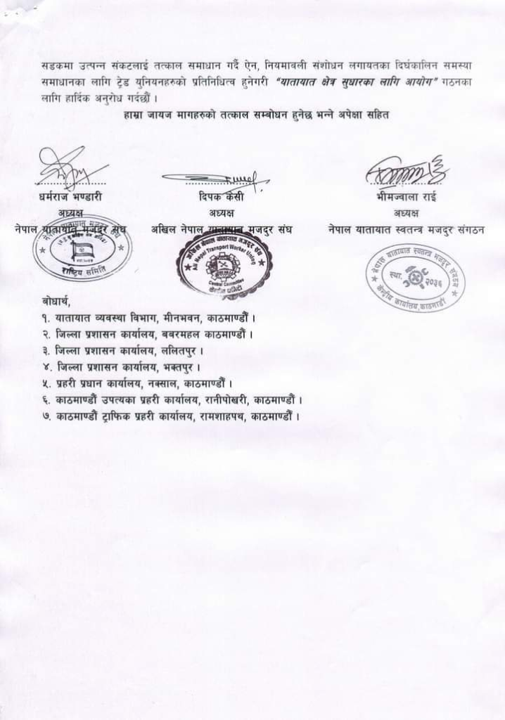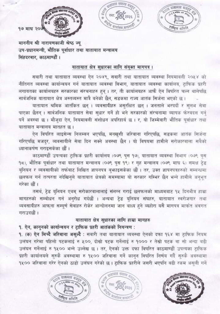 ट्राफिक प्रहरीले आतंक मच्चाएको भन्दै तीन यातायात संगठनले सरकारसँग विभिन्न माग राखेका छन् । नेपाली कांग्रेस निकट नेपाल यातायात मजदुर संघ, नेकपा (एमाले) निकट नेपाल यातायात स्वतन्त्र मजदुर सङ्गठन र नेकपा (माओवादी केन्द्र) निकट अखिल नेपाल यातायात मजदुर संघले मंगलबार उपप्रधानमन्त्री तथा भौतिक पूर्वाधार तथा यातायातमन्त्री नारायणकाजी श्रेष्ठलाई भेटेर माग राखेका हुन् ।
