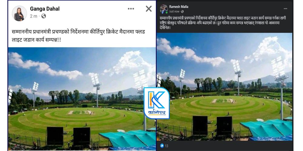 टीयू ग्राउन्डमा चारवटा फ्लडलाइट जडिएको फोटो राख्दै गंगाले लेखेकी छिन्, ‘सम्माननीय प्रधानमन्त्री प्रचण्डको निर्देशनमा कीर्तिपुर क्रिकेट मैदानमा फ्लड लाइट जडान कार्य सम्पन्न ।’