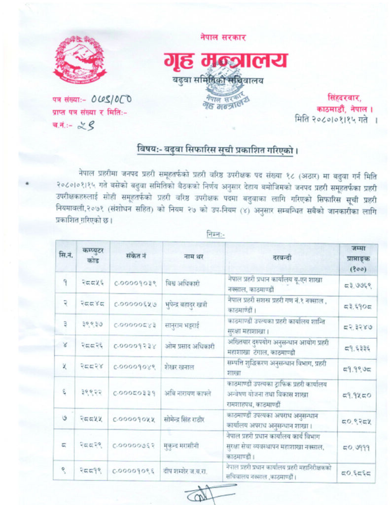 नेपाल प्रहरीका १८ जना एसपीहरु एसएसपीमा बढुवाका लागि सिफारिस भएका छन्। शुक्रबार बसेको बढुवा समितिले एसएसपी बढुवा सिफारिस गरेको हो। यसअघि १३ जना डीआईजीमा बढुवा भएपछि र बाँकी एसएसपीबाटै अवकास भएपछि रिक्त १८ एसएसपी पदहरुमा बढुवाका लागि सिफारिस गरिएको हो।