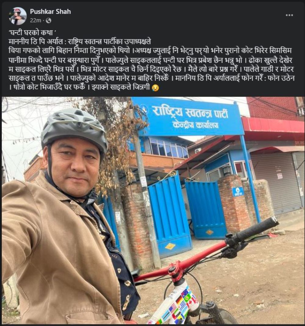 माननीय डि पि अर्याल : राष्ट्रिय स्वतन्त्र पार्टीका उपाध्यक्षले चिया गफको लागि बिहान निम्ता दिनुभएको थियो ।अध्यक्ष ज्युलाई नि भेट्नु पर्यो भनेर पुरानो कोट भिरेर सिमसिम पानीमा भिज्दै घन्टी घर बसुन्धारा पुगेँ । पालेज्युले साइकललाई घन्टी घर भित्र प्रबेश छैन भन्नु भो । ढोका खुल्लै देखेर म साइकल लिएरै भित्र पसेँ । भित्र मोटर साइकल चै छिर्न दिइएको रैछ । मैले त्यो बारे प्रश्न गरेँ । पालेले गाडी र मोटर साइकल त पाउँछ भने । पालेज्युको आदेश मानेर म बाहिर निस्केँ । माननिय डि पि अर्याललाई फोन गरेँ : फोन उठेन । थोत्रो कोट भिजाउँदै घर फर्केँ । झ्याक्ने साइकले जिन्नगी 😢’