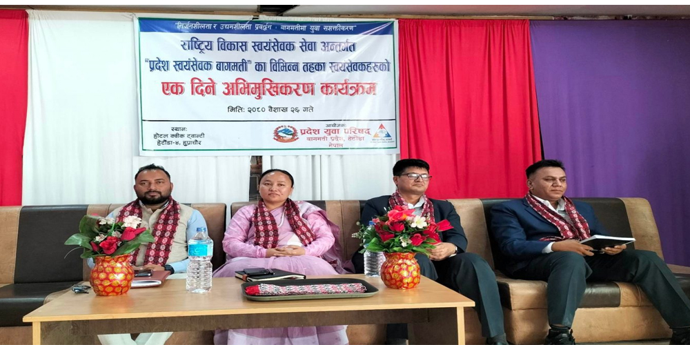 राष्ट्रिय विकास स्वयंसेवक अन्तरगत ‘‘प्रदेश स्वयंसेवक बागमती’’ का विभिन्न तहका स्वयंसेवकहरूको अभिमुखी कार्यक्रममा प्रदेशका सामाजिक विकास मन्त्री कुमारी मुक्तानले यो सेवा गर्ने ठुलो अवसर रहेकाले काम गरेर देखाउन आग्रह गर्नुभयो । खटिएका स्थानीय तहमा राम्रो सेवा गरेर जनताको मन जित्नसमेत उहाँले आग्रह गर्नुभयो । दक्षताका आधारमा छनोट गरिएकाले त्यही अनुसार काम गर्नका लागि मन्त्री मुक्तानले निर्देशन दिनुभयो ।