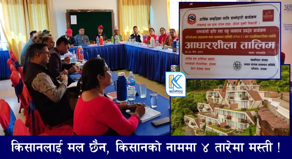 जेठ २६ सम्म चल्ने तालिमको शिर्षक राखिएको छ, ‘तामाकोशी कृषि तथा पशु व्यवसाय प्रवर्द्धन कार्यक्रम, परियोजना अनुगमन तथा समन्वय समिति (PMCC) का पदाधिकारीहरुको लागि आधारशिला तालिम’। यद्धपि तालिममा को-को सहभागी छन् भन्ने खुलाईएको छैन ।