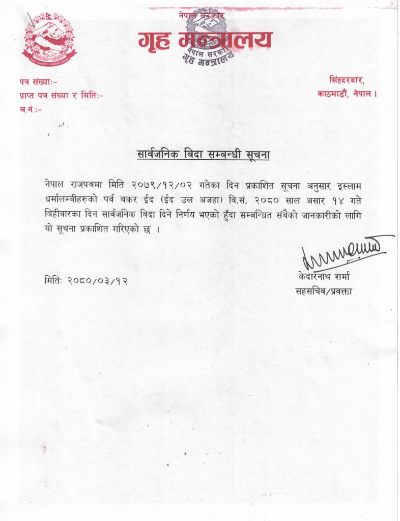 गृह मन्त्रालयले आज एक विज्ञप्ति जारी गर्दै इस्लाम धर्मालम्बीहरुको पर्व बकर इदका अवसरमा बिहीबार सार्वजनिक बिदा दिने निर्णय गरेको जनाएको हो ।