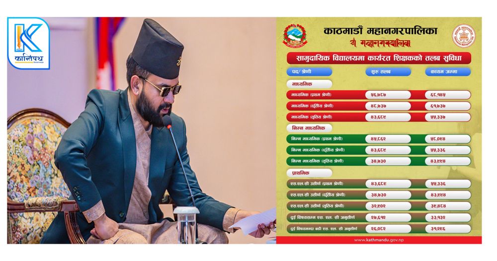 सामुदायिक विद्यालय सरह सुविधा नपाउने निजीका शिक्षकलाई उनले भनेका छन्, ‘सुविधा अनुसारको तलब सुविधा प्राप्त नभएमा काठमाडौँ महानगरपालिका शिक्षा विभागमा सम्पर्क गर्न अनुरोध गर्दछौँ।’