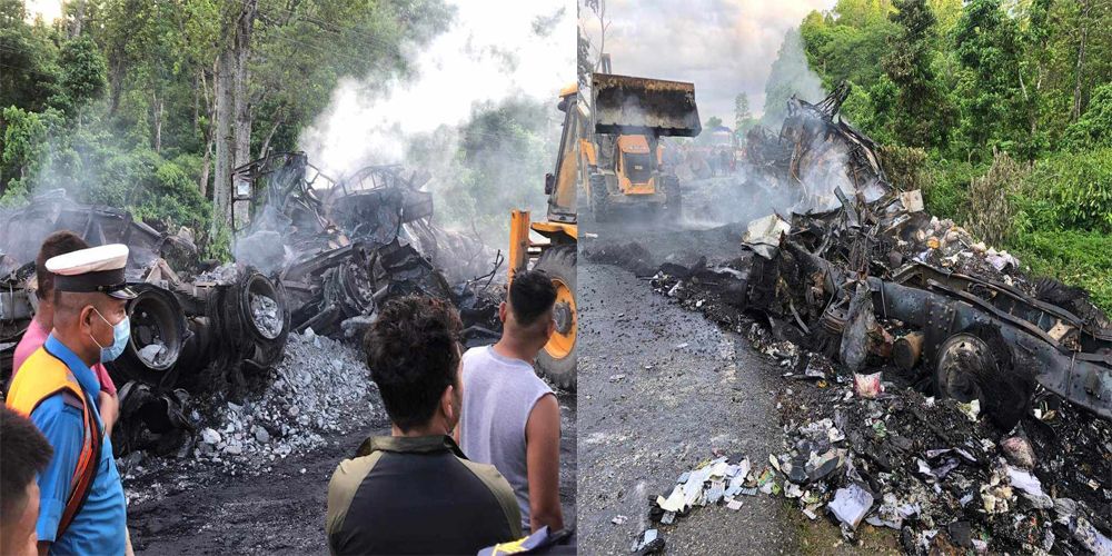 पूर्व पश्चिम सडक खण्डमा हेटौडाबाट चितवनतर्फ जाँदै गरेको ना ६ ख ६६६७ नम्बरको ट्रक र विपरीत दिशा तर्फबाट आउँदै गरेको ना ६ ख ६३१ नम्बरको ट्रक मकवानपुरको मनहरी गाउँपालिका–६, स्थित नयाँबस्ती डिपाट गाउँमा एक आपसमा ठक्कर खाई दुर्घटना हुँदा दुवै ट्रकमा आगलागी भएको प्रहरीले जनाएको छ ।