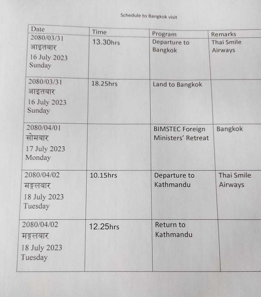 आइतबार दिउँसो साढे १ बजे उनी थाई स्माइल एयरवेजमार्फत बैंकक प्रस्थान गर्ने कार्यसूची रहेको उनको सचिवालयले जानकारी दिएको छ।