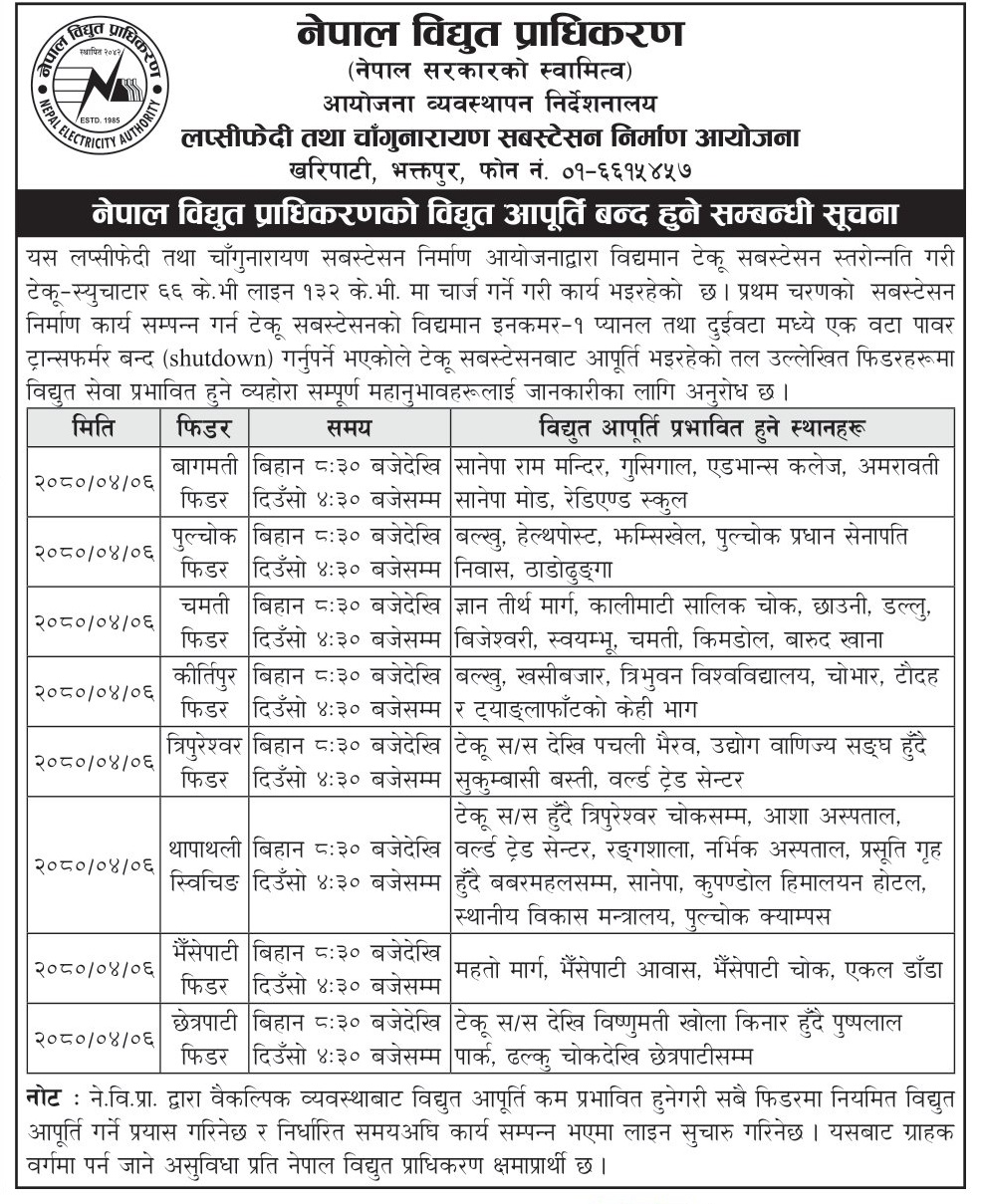 प्राधिकरणका अनुसार बागमती फिडर अन्तर्गतका सानेपा राम मन्दिर, गुसिगाल, एडभान्स कलेज, अमरावती, सानेपा मोड र रेडिएण्ड स्कुल क्षेत्रमा विद्युत प्रभावित हुनेछ । त्यसैगरी पुल्चोक फिडर अन्तर्गतका बल्खु, झम्सीखेल, पुल्चोक र ठाडोढुंगा क्षेत्रमा विद्युत प्रभावित हुनेछ ।