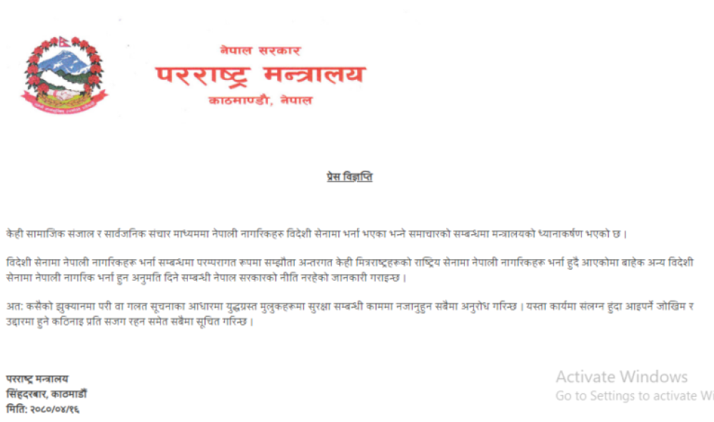 • गलत सूचनाका आधारमा विदेशको सेनामा काम गर्न नजान परराष्ट्र मन्त्रालयको आग्रह
