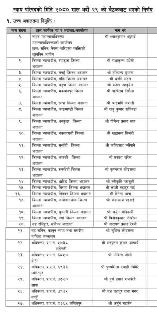 न्याय परिषद्ले उच्च अदालतका लागि २७ जना न्यायाधीशहरुको नाम सिफारिस गरेको छ।