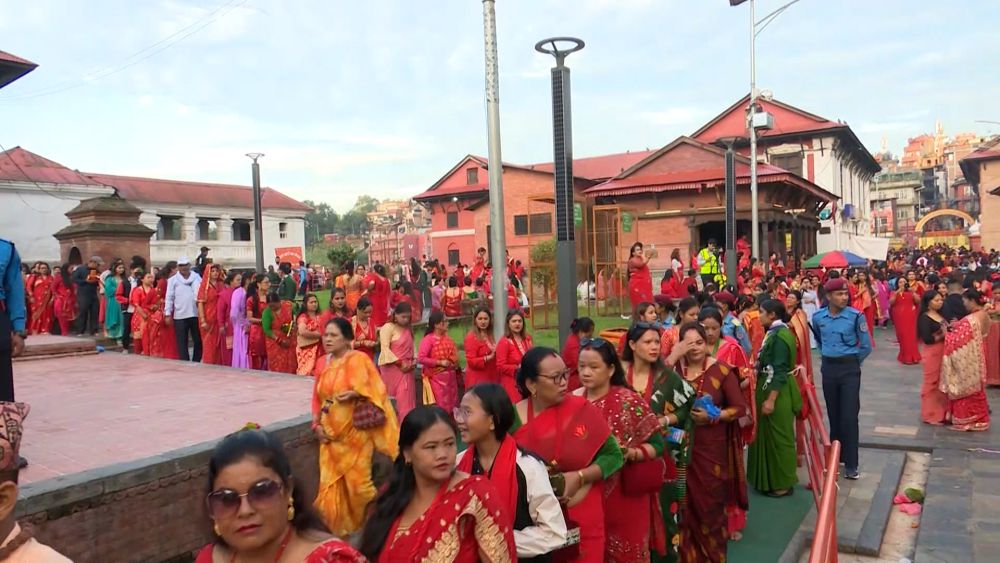काठमाडौं- हिन्दू नारीहरुले पशुपतिनाथ मन्दिरमा आफ्नो महान पर्व तीज हर्षोउल्लासका साथ मनाइरहेका छन् । रातो साडीमा सजिएका नारीहरुले तीजको अवसर पारेर सोमबार बिहानैदेखि पशुपतिनाथको दर्शन गरी पशुपतिनाथ परिसरमा नाचगान गरिरहेका हुन्।