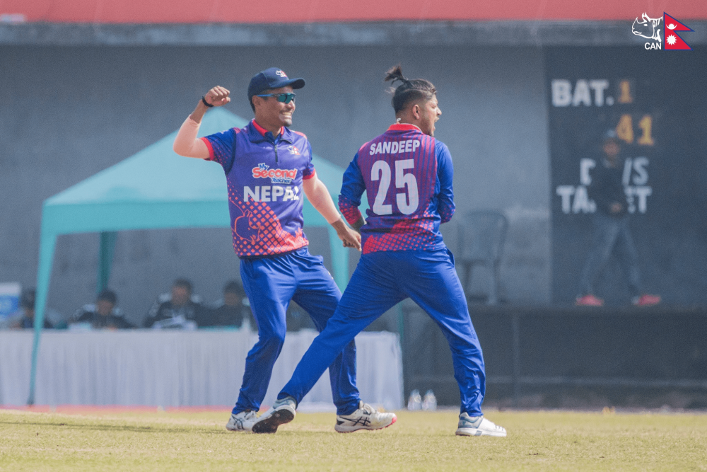सन्दीप लामिछानेले माल्दिभ्सको छैटौँ विकेट लिए । यसअघि, अभिनाश बोहराले ३ विकेट लिएका थिए भने गुल्शन झा र सोमपाल कामीले १–१ विकेट लिए ।