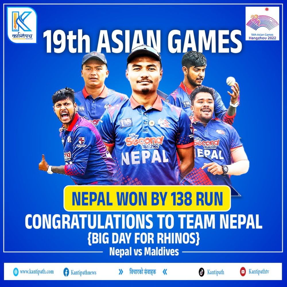 नेपाल चीनमा जारी १९ औँ एसियाली खेलकुद अन्तर्गत पुरुष क्रिकेटको क्वाटरफाइनल पुगेको छ ।