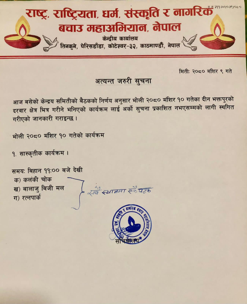 आजका लागि भक्तपुरको दरबार क्षेत्रमा तय भएको कार्यक्रम स्थगित भएको छ। अभियानको शनिबार बसेको केन्द्रीय समिति बैठकले दरबार क्षेत्रमा गरिने भनिएको कार्यक्रम अर्को सूचना प्रकाशित नभएसम्मका लागि स्थगित गरिएको अभियानले जनाएको छ। त्यसको सट्टामा आइतबार सांस्कृतिक कार्यक्रम हुनेछ। बिहान ११ बजेदेखि कलंकी चोक, बालाजु बिजी मल र रत्नपार्कमा कार्यक्रम हुने जनाइएको छ।