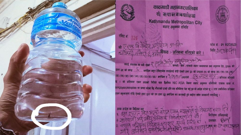 उक्त कम्पनीले उत्पादन गरेको सिल लगाएको पानीको बोतलभित्र किरा भेटिएपछि महानगरपालिकाले एक लाख रुपैयाँ जरिबाना तिराएको काठमाडौं महानगरपालिकाका प्रवक्ता नवीन मानन्धरले जानकारी दिए।